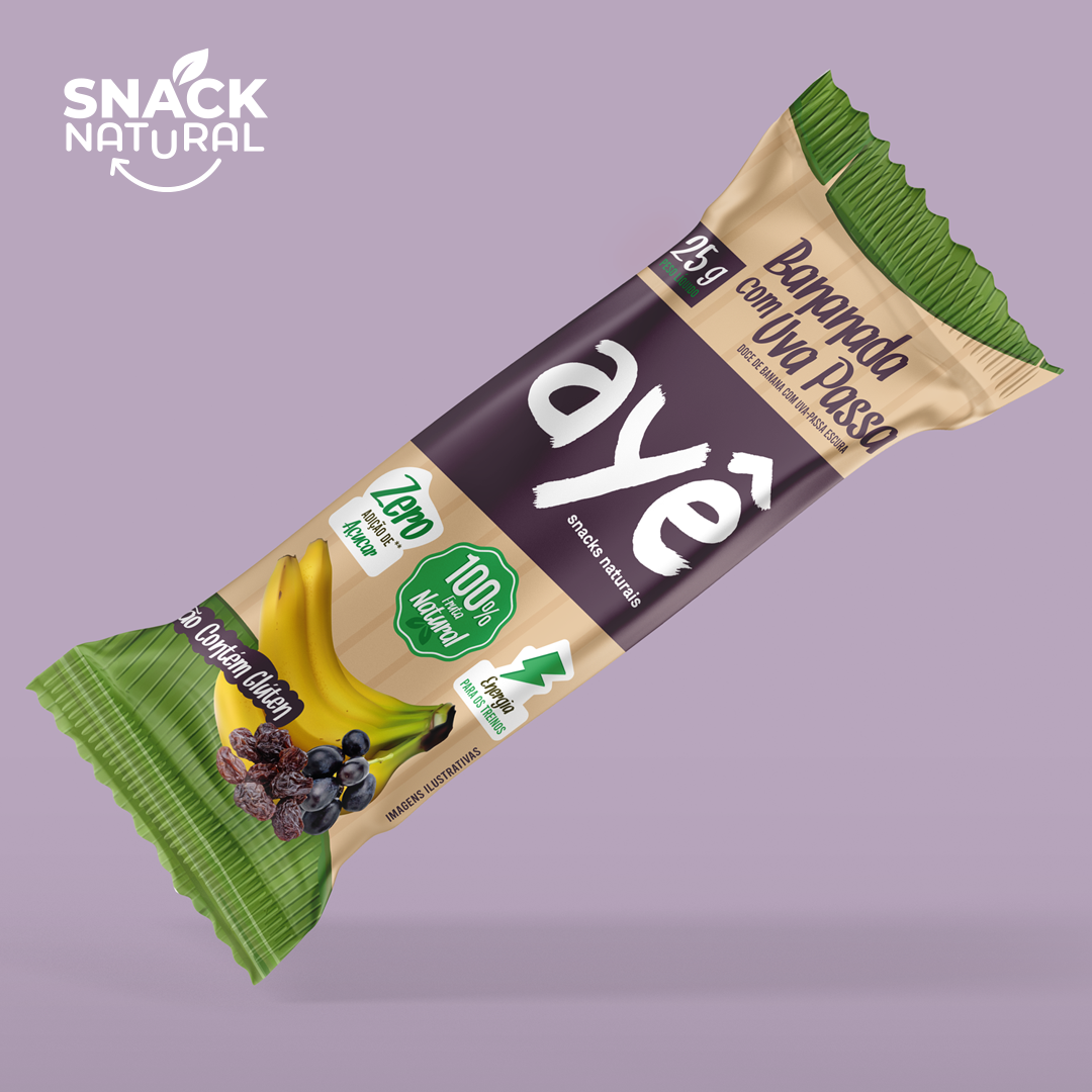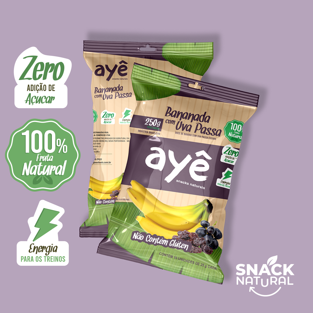 Delicie-se com a Bananada com Uva Passa Ayê, o snack natural que oferece energia e sabor em cada mordida. Feita com 100% fruta, zero adição de açúcar e sem glúten. Ideal para um lanche nutritivo e prático a qualquer hora.