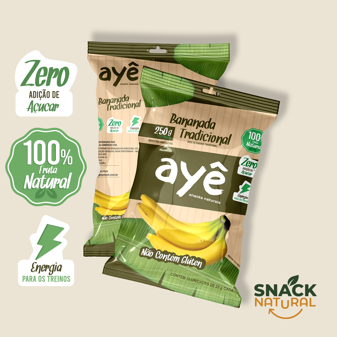 A Ayê Snacks Naturais acredita que o bem-estar começa com escolhas conscientes. Por isso, nossa Bananada Tradicional é o parceiro perfeito para sua rotina, seja no trabalho, na academia ou em um momento de lazer. Leve, prática e incrivelmente saborosa, ela oferece a energia que você precisa para ir além, mantendo o foco na saúde real e na naturalidade dos ingredientes. Experimente a pureza da banana em um formato conveniente e faça da Ayê parte do seu dia a dia!